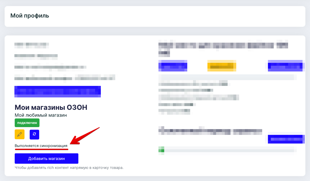 После добавления магазина сервису потребуется пару минут, чтобы подгрузить наименования Ваших товарных карточек. Вы увидите надпись — "Выполняется синхронизация".