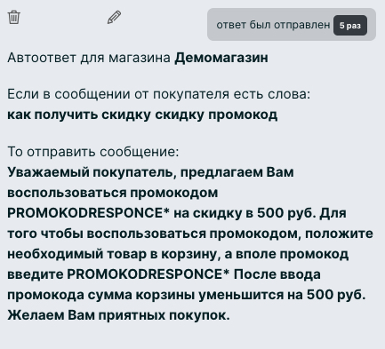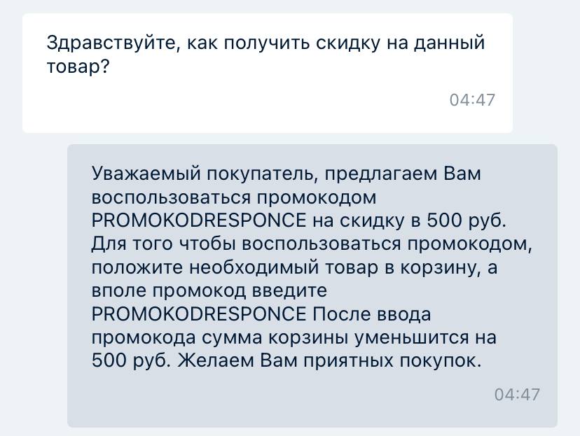 * Промокод PROMOKODRESPONCE — пример. Слово для промокода может быть любым. Промокод, который Вы добавите в ответ — должен быть добавлен в Ваш магазин и действовать на все товары.
