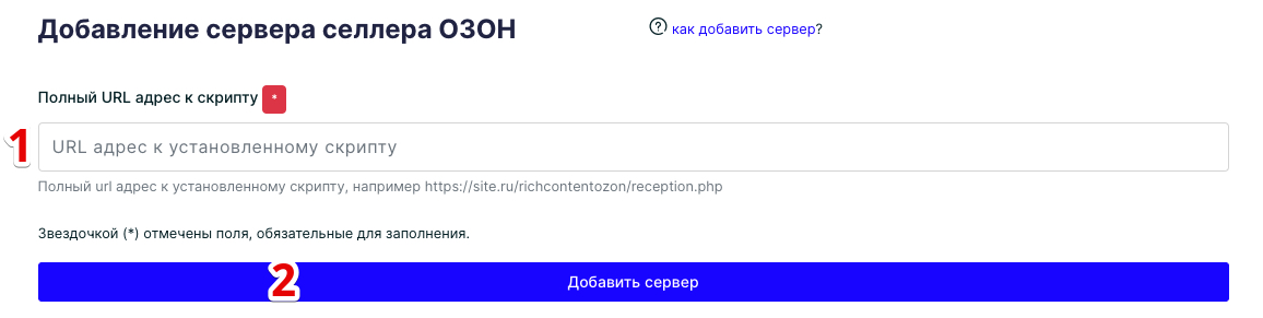 7) На открывшейся странице вписать в поле (на скриншоте под номером 1) полный url адрес к файлу reception.php — например https://вашсайт.ru/richcontentozon/reception.php и нажать кнопку "Добавить сервер" (на скриншоте под номером 2).