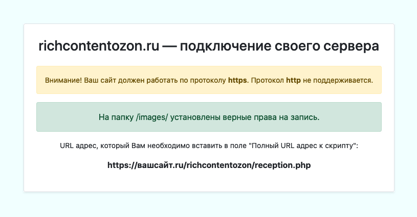 5) Скопируйте url строчку из скрипта проверки, в данном примере эта строчка https://вашсайт.ru/richcontentozon/reception.php